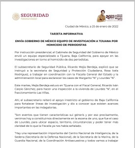 Integra Gobierno de México equipo del Gabinete de Seguridad a investigacion de asesinato de periodistas de Tijuana