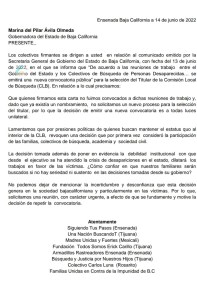 Ocho de los catorce colectivos de búsqueda de desaparecidos, reconocidos en Baja California, hicieron un llamado de rechazo al Gobierno del Estado por la nueva convocatoria que se realizará para designar a otro Titular de la Comisión Local de Búsqueda (CLB), luego de que la Secretaría General de Gobierno cedió a las protestas de otros 5 colectivos para que cambiar a Rafael Hernández, recién nombrado funcionario estatal encargado de dicha Comisión.